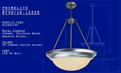 Primelite’s featured fixture this week is the #730/10 LED20. This interior ceiling fixture is available in multiple diameters of 20″ – 48″. Comes with a 20 Watt LED light engine, is dimmable and available in 3000K (1140 lumens) and 4000K (1200 lumens). Choose an acrylic lens in opal or faux alabaster (shown). Metal finishes in Chrome, Polished Brass and Brushed Nickel. Or choose from our standard powder coated colors (see color chart).