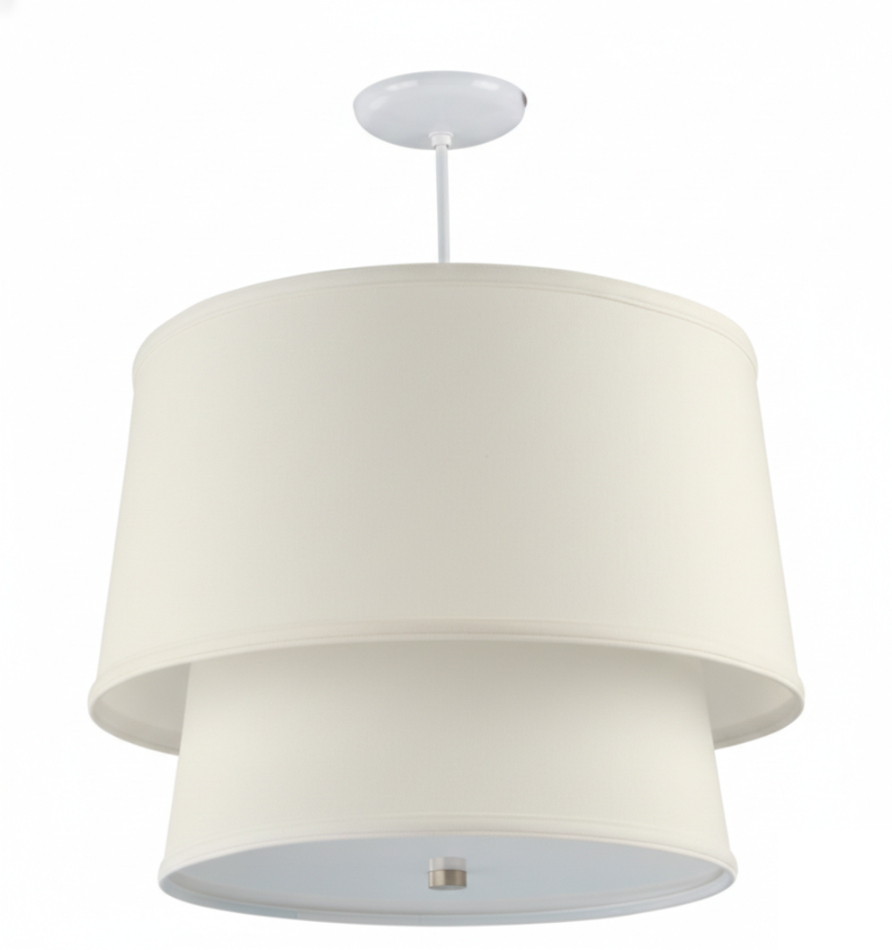 Description: Double tiered cream cloth drum shade pendant on a cord suspension and 5.25″ round canopy (Standard). Chain or stem options available. UL Listed.